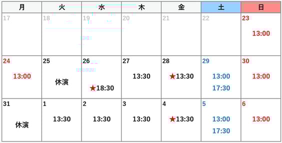 ※貸切等、日程及び開演時間は急遽変更となる場合がございます。予めご了承ください。
